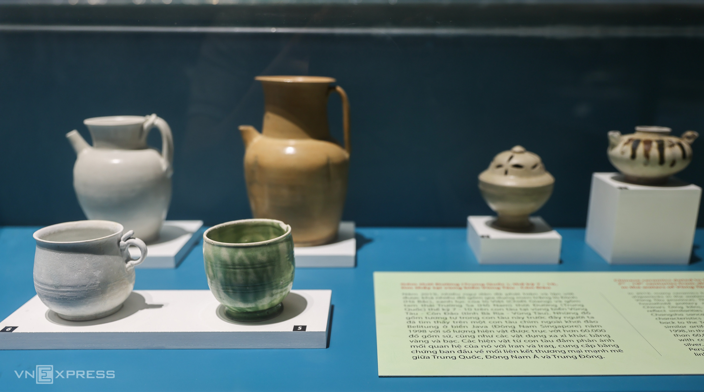 Xưa nhất là các cổ vật đồ gốm Trung Quốc như dĩa, ấm, bình, ly, lư xông trầm niên đại thế kỷ 7-10 thời nhà Đường. Cổ vật được ngư dân lặn biển tìm thấy tại Côn Đảo (Bà Rịa - Vũng Tàu) năm 2019. Theo tài liệu của bảo tàng, những đồ gốm tương tự trước đây cũng được tìm thấy trên một con tàu chìm ngoài khơi đảo Belitung ở biển Java (Đông Nam Singapore) năm 1998.
